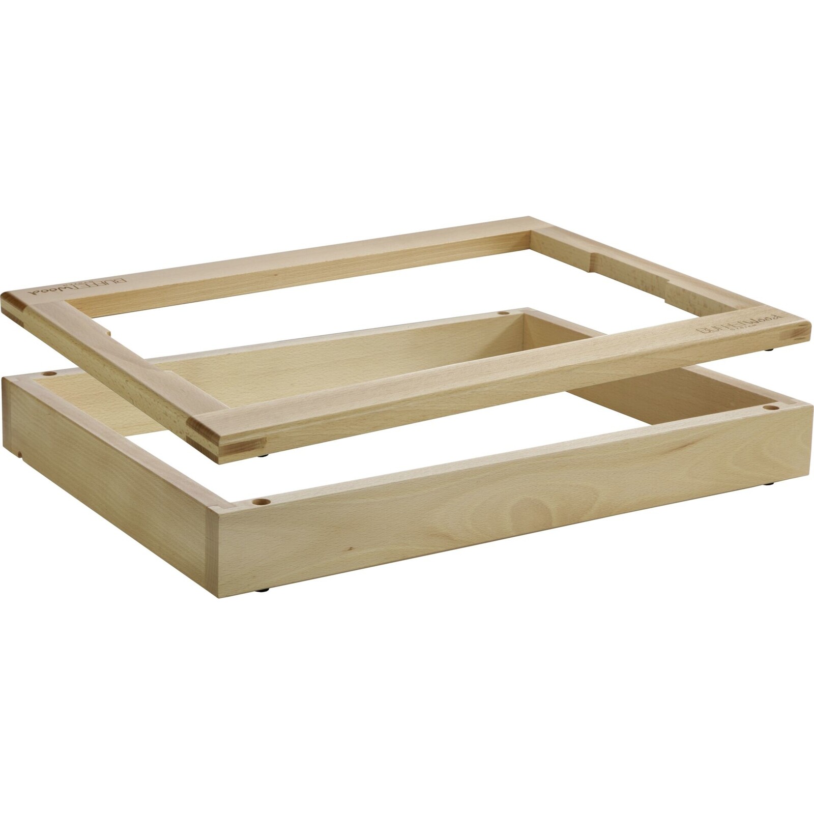 Buche natur lackiert. LxBxH in cm: 58x40,5x8,5. 1x Basiselement + 1x Rahmen für alle Aufsätze 1/1 GN (außer Wasserbad).