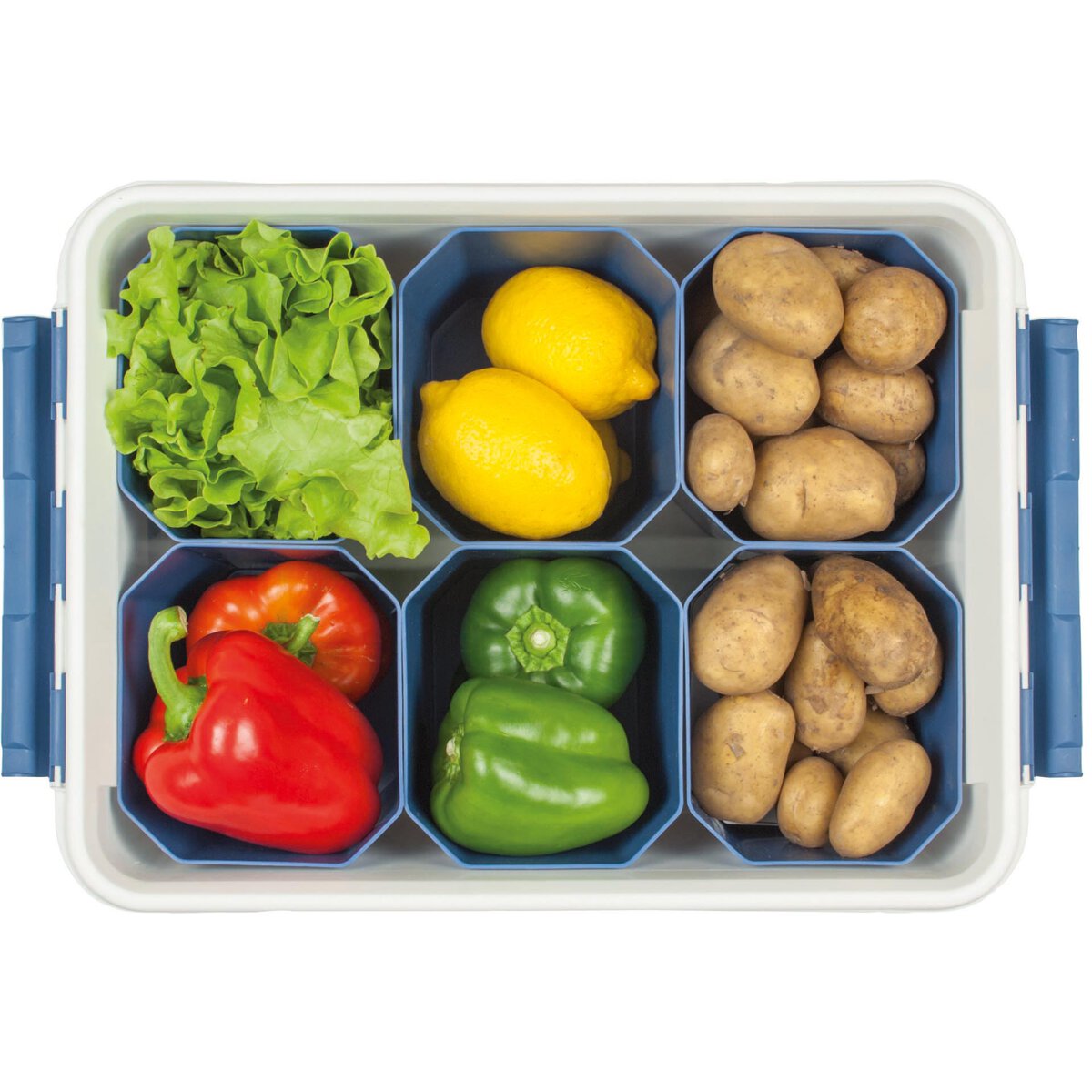 Weiß. Für Transport und Lagerung von Lebensmitteln oder Geschirr, Besteck etc. Schlagfest, stapelbar und beständig gegen Temperaturwechsel (-40 bis + 120°C). Mit Deckel und Verschlussclips. 10 Jahre Garantie. Dazu sind 3 verschiedene Einsätze erhältlich: 150304: Einsatz 13x12x15 cm, transparent. 150305: Einsatz 6er Set, transparent bestehend aus 3 Boxen á 25x11 cm + 3 Boxen á 10,3x8,3 cm. 150306: Einsatz 37x28x9 cm transparent.