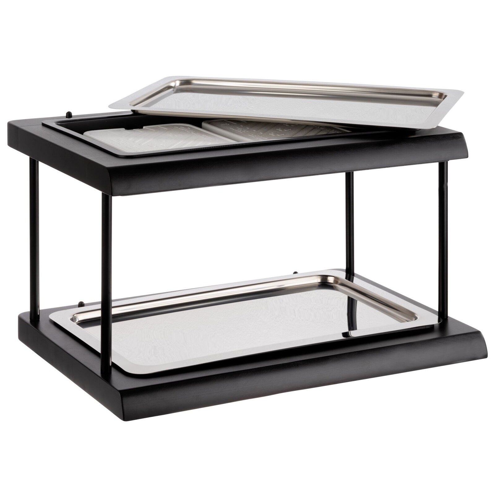 12 tlg. Set bestehend aus 2 Boxen (Buchenholz schwarz) mit Kunststoffwanne +2 Edelstahltabletts GN 1/1 + 4 Kühlakkus (Lieferung ohne Haube) + 4 schwarze Stangen. Passende Haube: Artikel 16661