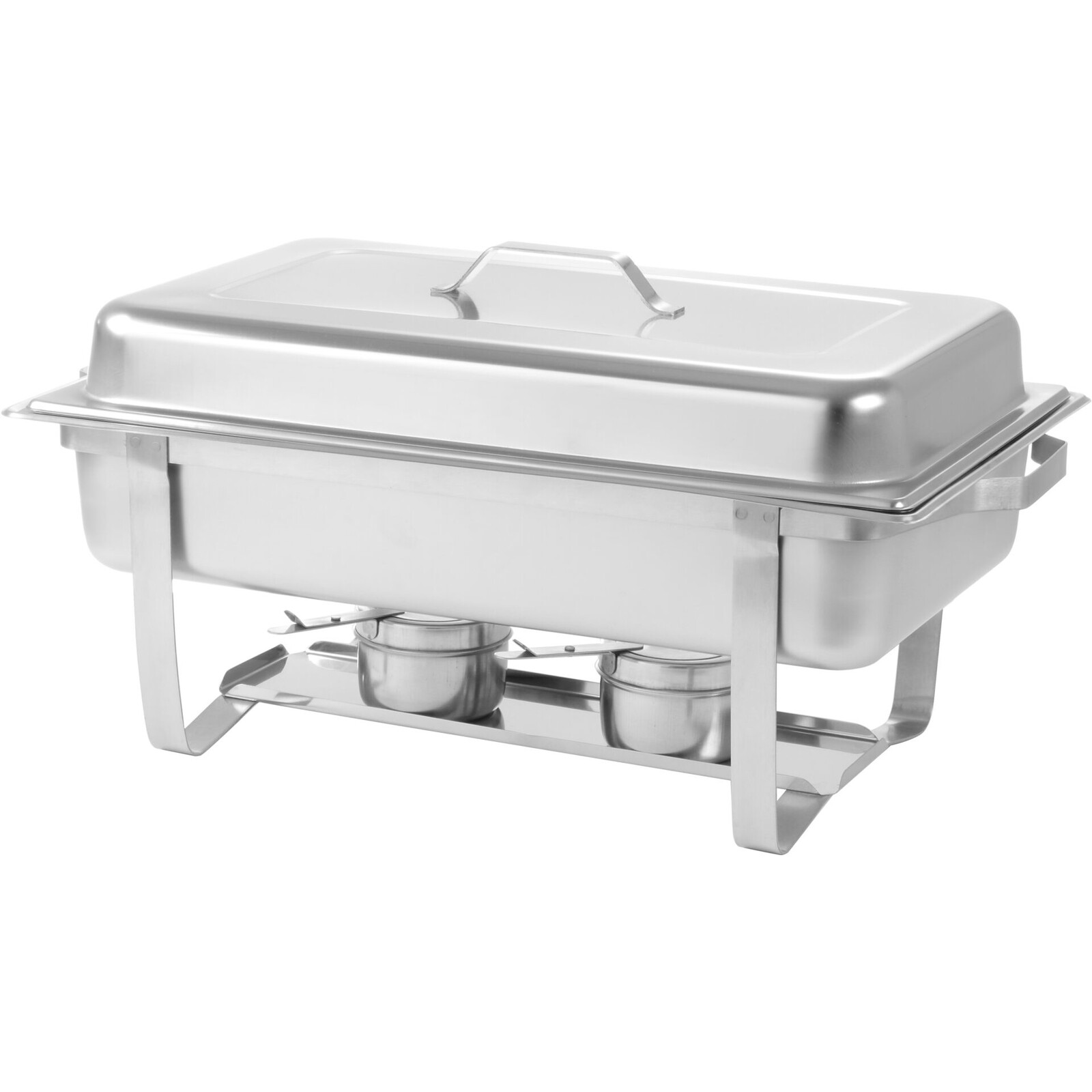 Edelstahl: 18/0, Inhalt: 9 Liter. Mit jeweils einem hochglanzpolierten, einsteckbaren Deckel, einer GN 1/1 Lebensmittelpfanne, 65 mm tief und 2 Brennpastenbehältern. Geeignet für Gastronorm Behälter bis 65 mm tief.