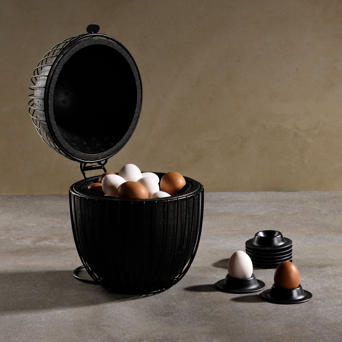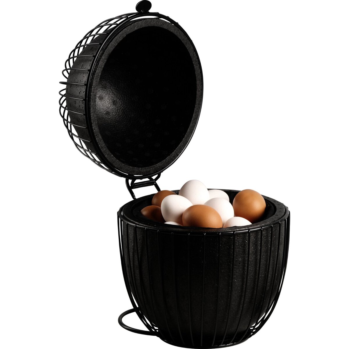 Metall, schwarz, EPP, Baumwolle. Für ca. 35 Eier. Stoffeinsatz feucht abwischbar. Nicht Spülmaschinengeeignet.