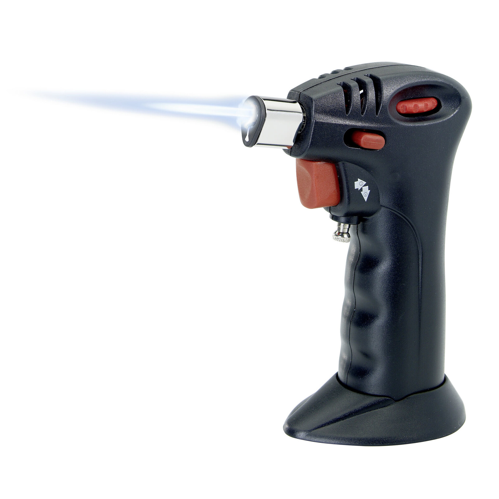 Kunststoff, Metall. Zum Karamelisieren, Gratinieren, Überkrusten und Bräunen. Größe der Flamme einstellbar. Einhandbedienung mit Kindersicherung. Nachfüllbar mit Butan-Feuerzeuggas. Gasfüllung nicht im Lieferumfang enthalten.