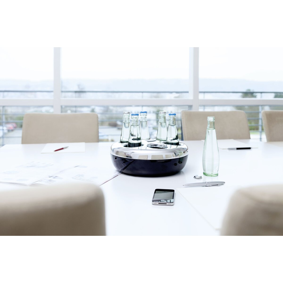 Chrom, schwarz. Einstellmöglichkeit für 6 Flaschen von 0,2L bis 0,33L (max. 0,5L möglich), sehr gute Kühlfunktion durch innenliegendes Kühlakku-Element. Vorgekühlte Getränke bleiben bis zu sechs Stunden frisch und kühl. Ober- und Unterteil bestehen aus robustem Kunststoff ABS ggf. verchromt, H ohne Deckel: 7,0 cm, H inkl. Deckel: 10,0 cm, Ø Boden: 27,0 cm, nicht spülmaschinengeeignet, nicht bruchfest.