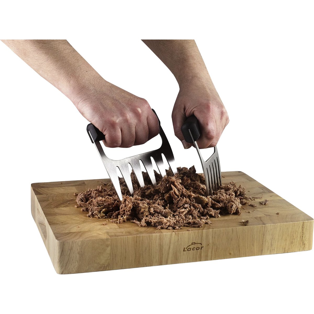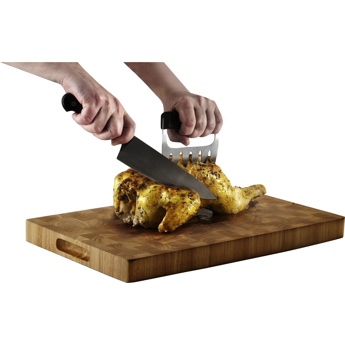 Edelstahl. Ergonomisch geformter schwarzer Kunststoff-Griff für festen u. perfekten Halt. Griffstärke: 2 cm. Je 6 spitze Krallen (Länge: 5 cm) aus Edelstahl zum Greifen und Zerkleinern/Zerreißen von Pulled Pork, Pulled Beef, Braten etc. Auch zum Vermengen von Salaten geeignet. Spülmaschinengeeignet. Im 2er Pack.