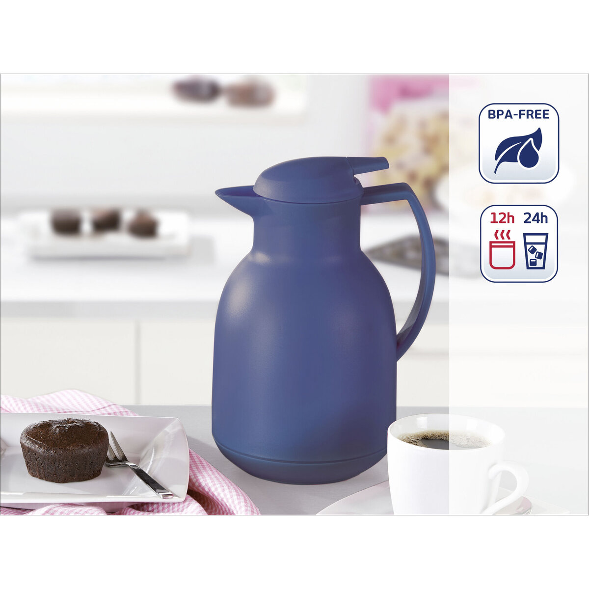 Mit doppelwandigem Vakuum-Glas-Kolben. Aus Kunststoff, in edlem mattschwarz. Öffnen, Gießen, Schließen mit nur einer Hand. Garantiert eine extrem lange Wärme- und Kälteisolierung. Inhalt: 1 Liter, ca. für 8 Tassen. 3 Jahre Garantie. Nicht spülmaschinengeeignet.