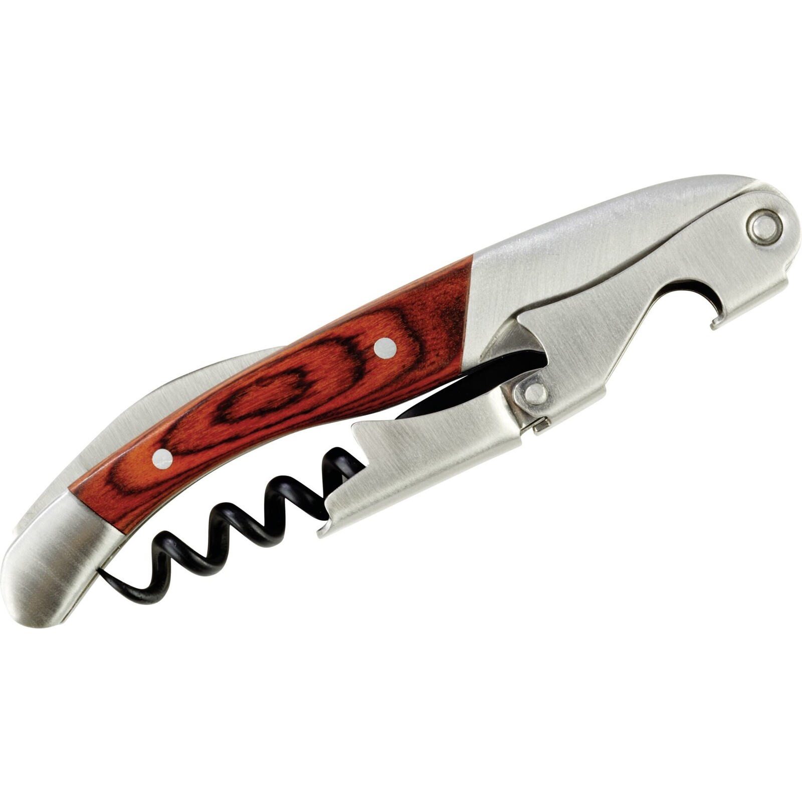 Edelstahl/ Holz, mit edlem Holzgriff, inkl. Flaschenöffner, Korkenzieher und Messer mit Sägeblatt.