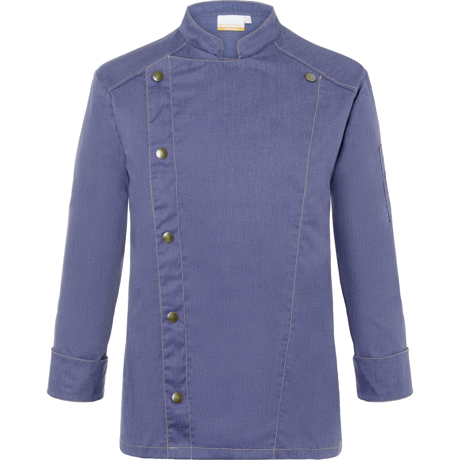 Farbe: Vintage blue. Trendige Kochjacke in Jeans-Optik mit schlanker Silhouette. Kontrastfarbige Steppnähte für den originalen Jeans-Look. Asymmetrisch geschlossene, einreihige 5-Knopf-Jacke mit Druckknöpfen zum schnellen Öffnen und Schließen. Ärmelmanschetten mit Schlitz. Aufgesetzte Ärmeltasche links mit praktischem Stiftfach. Industriewäschetauglich (95°C). 65% Polyester/ 35% Baumwolle. Köpergewebe, 195 g/m². Hochveredelt, gekrumpft, waschecht, pflegeleicht.