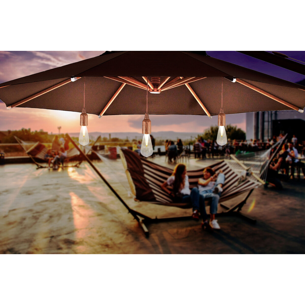 Sonnenschirm-Hängebeleuchtung mit integr. LED und Akku, braun. Kordellänge: 102 cm, Gesamtlänge mit Lampen: 124 cm. Wasserdicht nach IP54. Inkl. USB C Ladekabel. Lichttemperatur: 2800K. Im 3er Pack.