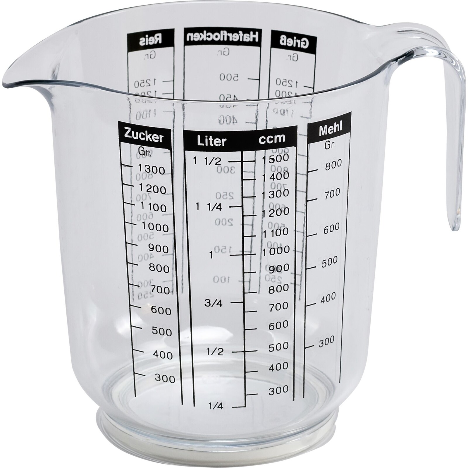 SAN Styrolacrylnitril, transparent. Mit Gummifuß. Messskala, schwarz für Mehl und Zucker, Maßeinheit in Liter und ccm. Skalen für Grieß, Haferflocken und Reis in Gramm auf gegenüberliegender Seite. Spülmaschinengeeignet. Made in Germany!