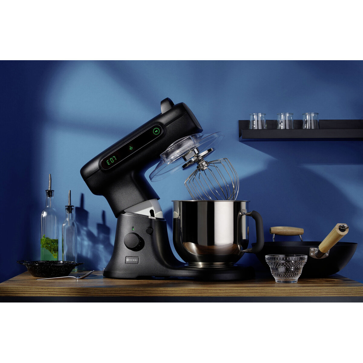 Gehäuse aus Aluminiumdruckguss. Schüssel aus Edelstahl. Silikonbeschichteter Griff für sicheren Halt. Robuste Konstruktionsweise für stabilen Betrieb. Geräuscharmer und langlebiger Motor. Das Kühlsystem ermöglicht einen Dauerbetrieb von bis zu 60 Minuten. 11 Geschwindigkeitseinstellungen. Timer-Funktion. Vier voreingestellte Programme: Teig kneten, Biskuitmasse, Sahne schlagen, Eischnee schlagen. Überhitzungsschutz. Fassungsvermögen: 7 Liter. 0,2-1,5 kg Mehl. 2-20 Eiweiße. 150-1500 ml Schlagsahne. 100-2000 ml saure Sahne. Zubehör (im Lieferumfang enthalten): - Schneebesen, Rührer und Knethaken aus Edelstahl (18/8) - Rührer mit Silikonrand aus PA (Polyamid/Nylon) Enthaltenes Zubehör ist spülmaschinengeeignet.