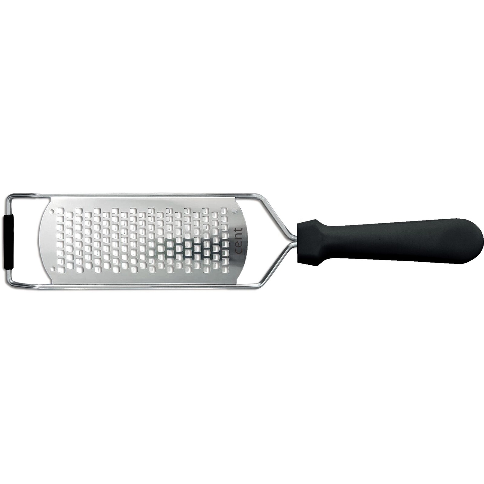 Reibe Edelstahl, schwarzer Kunststoffgriff, oval geformt, 31,5x6,5 cm, Spülmaschinengeeignet, Reinigung per Hand empfohlen.