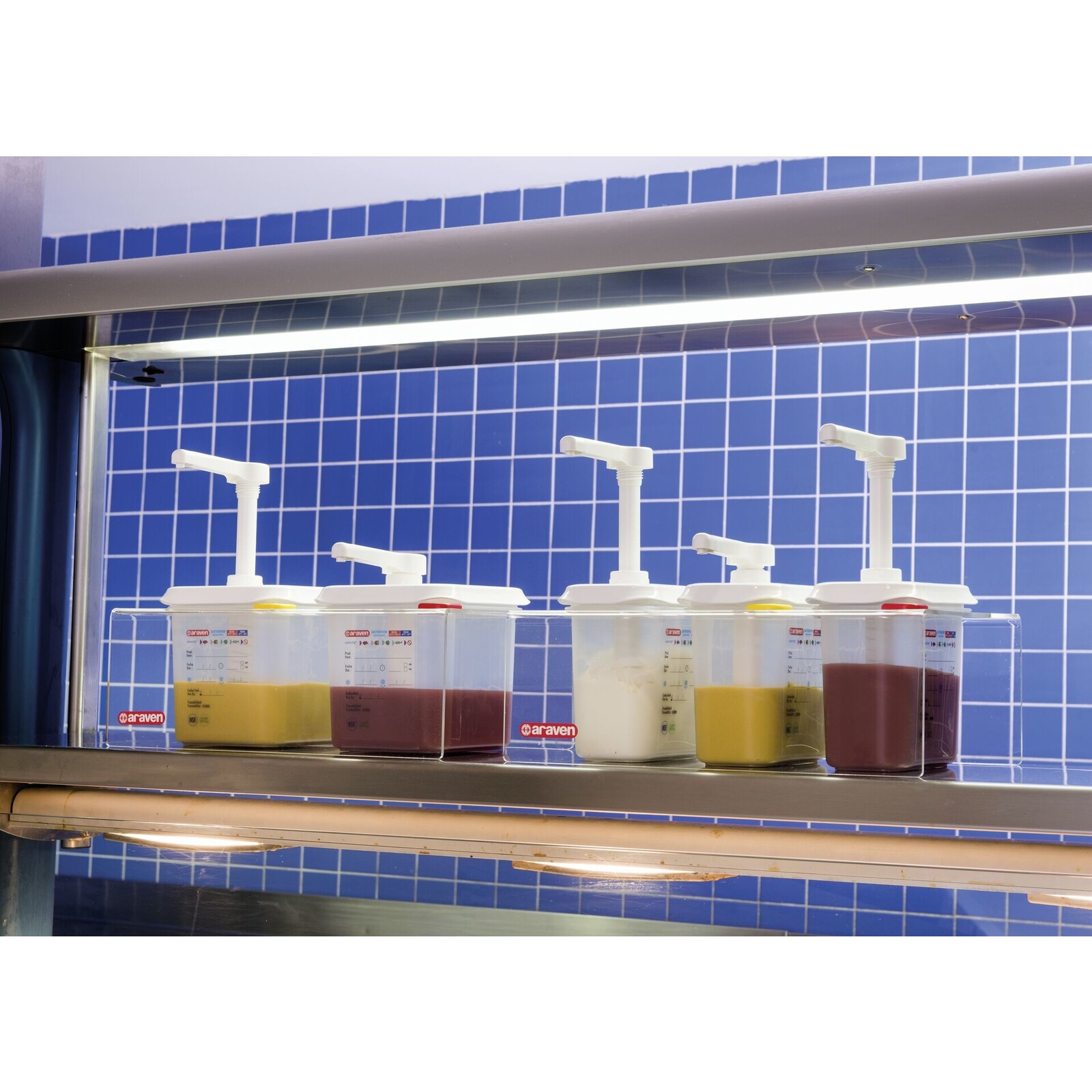 Polypropylen, transparent. Für Dressings, Soßen, Sirups, etc. Inkl. integrierter Skala, aufgedrucktes Etikett zum Beschriften mit Art.-Nr. 146700 (Stift schwarz), 4 farbliche Markierungsplättchen. Pumphahn ist platzsparend zu versenken.