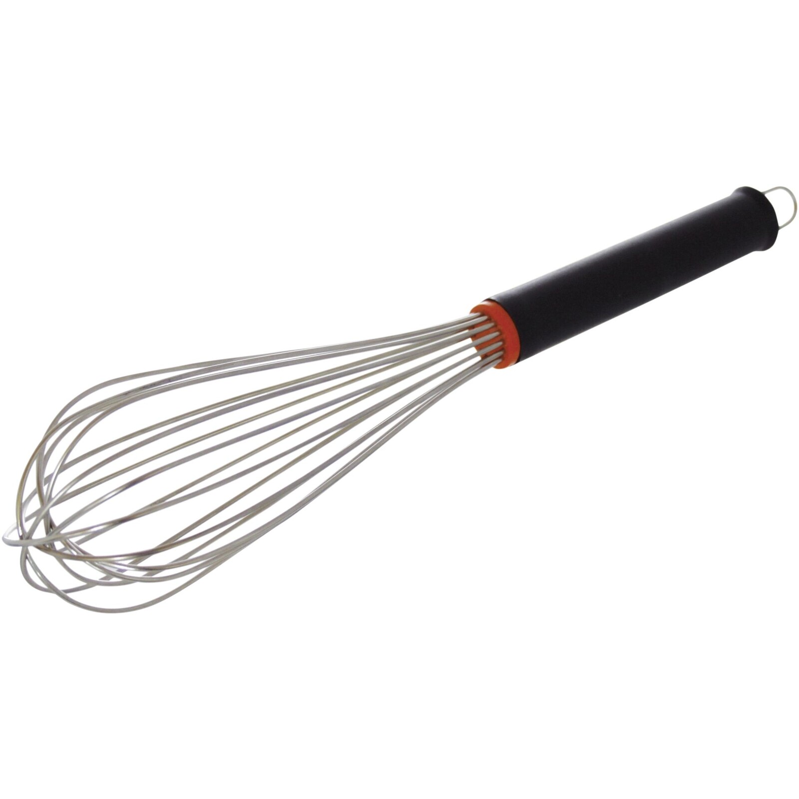 Schneebesen mit 24 Edelstahl-Drähten und schwarzem, thermoplastischen Griff mit Aufhängeöse. Hitzebeständig bis 200°C. Spülmaschinengeeignet!