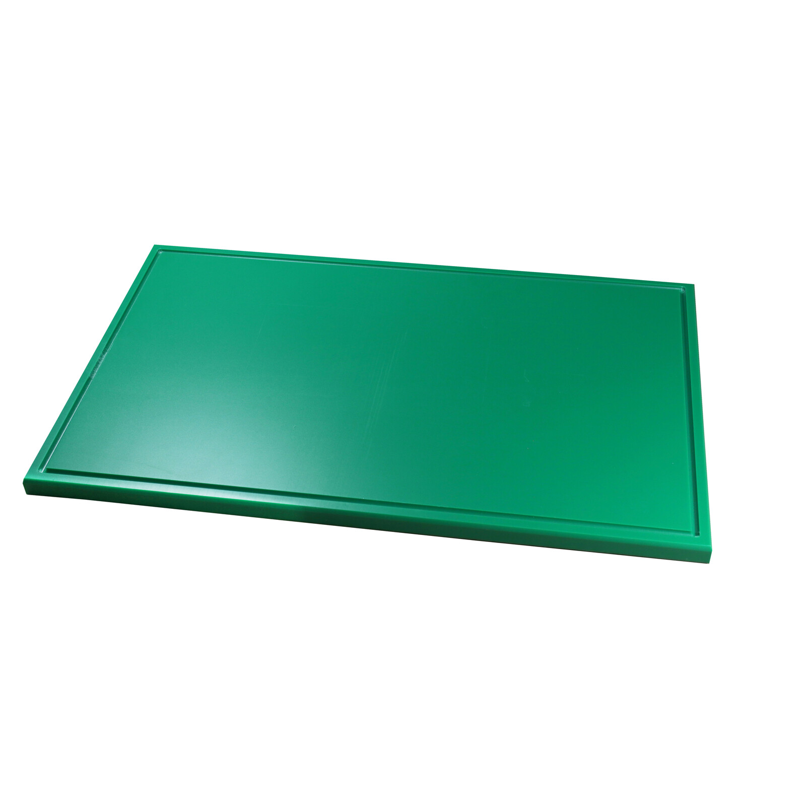 PE-Schneidbrett (Polyethylen) mit beidseitiger Fräsrille. Bis 80°C temperaturbeständig, darf beim Spülgang nicht geklemmt werden. Keine heißen Gefäße aufstellen, kann zum Verziehen führen.