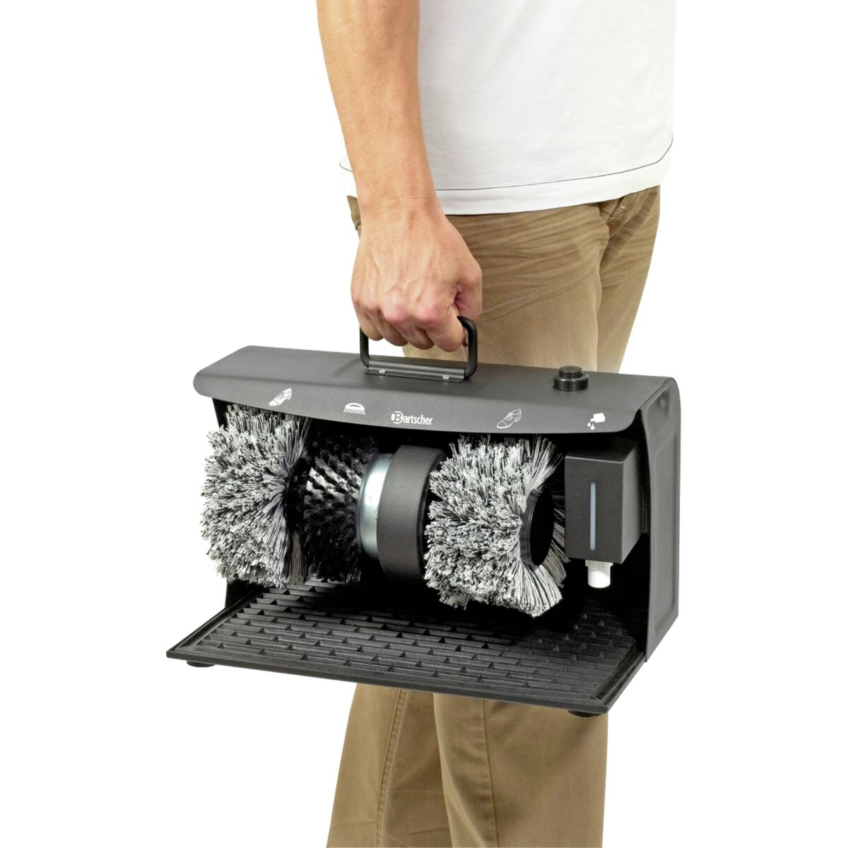 Material Stahl pulverbeschichtet, schwarz, ausgestattet mit: 3 leise laufenden Rotationsbürsten: 1 Reinigungsbürste für groben Schmutz, 2 Polierbürsten aus Terylen (Polyester) für helle oder dunkle Schuhe, Schuhcreme-Spender (unbefüllt) mit Kugelventil für 100 ml Flüssig-Schuhcreme, Schmutz-Auffangmatte für einfache Reinigung, Tragegriff oben am Gerät, wartungsfreier Motor, Fußbedienung einfach per Knopfdruck.