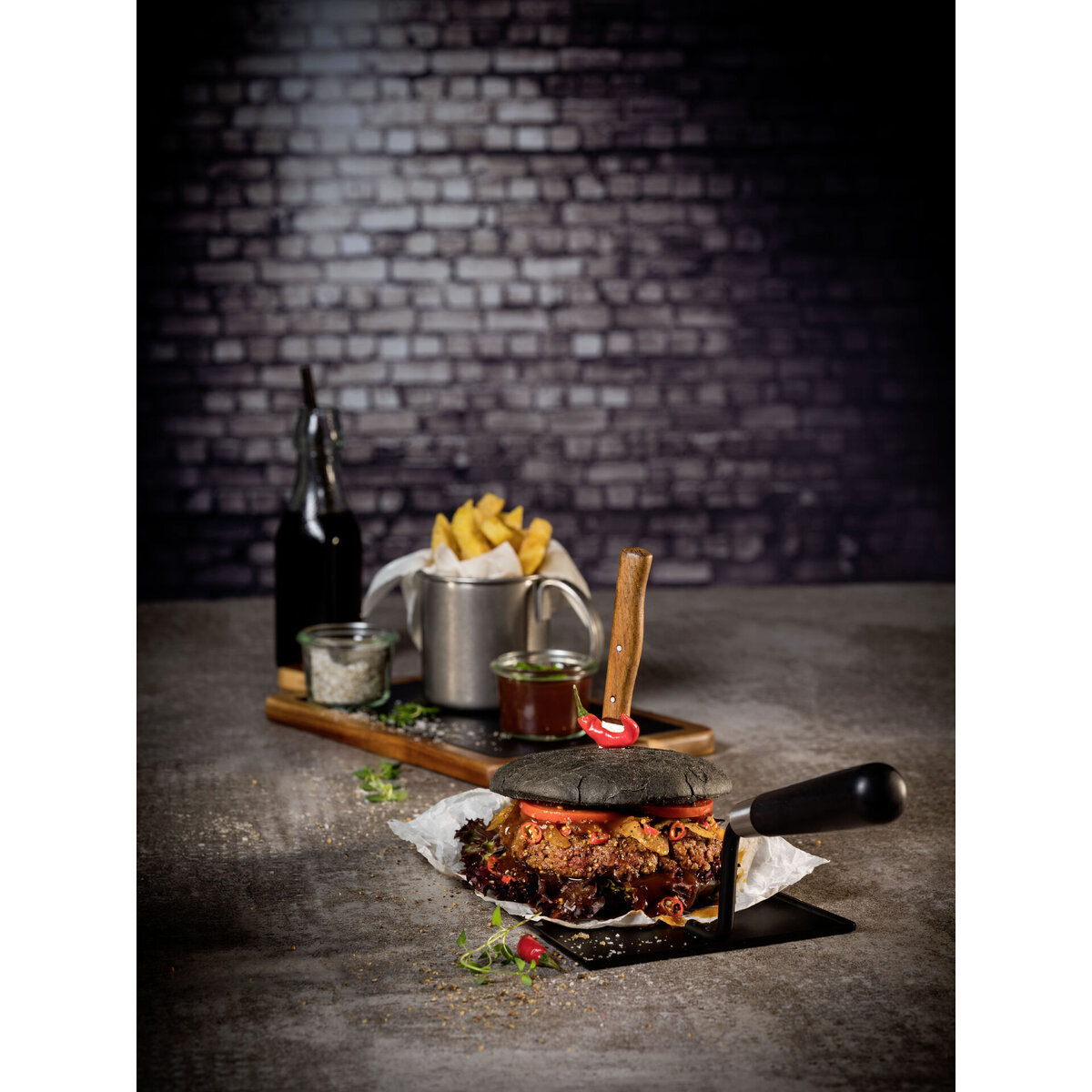 Schwarze Edelstahl Servierkelle mit schwarzem Holzgriff. Nicht als Tellerersatz oder Schneidunterlage, sondern ausschließlich zum Servieren geeignet. Oberfläche nicht kratzfest! Nicht spülmaschinengeeignet!