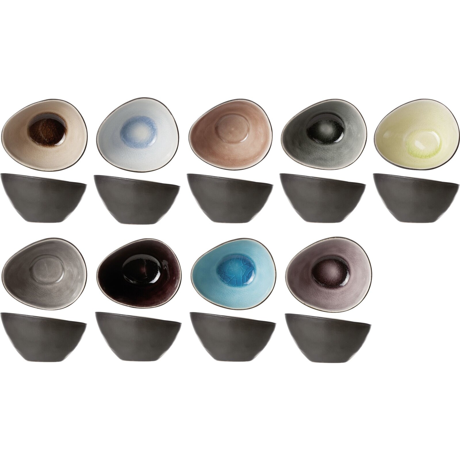 Steinzeug, in 10 verschiedenen Farben. Farbe changiert. Innen glänzend, außen schwarz matt. Jedes Teil individuell. Farbig sortiert. Im 10er Set. Spülmaschinengeeignet.