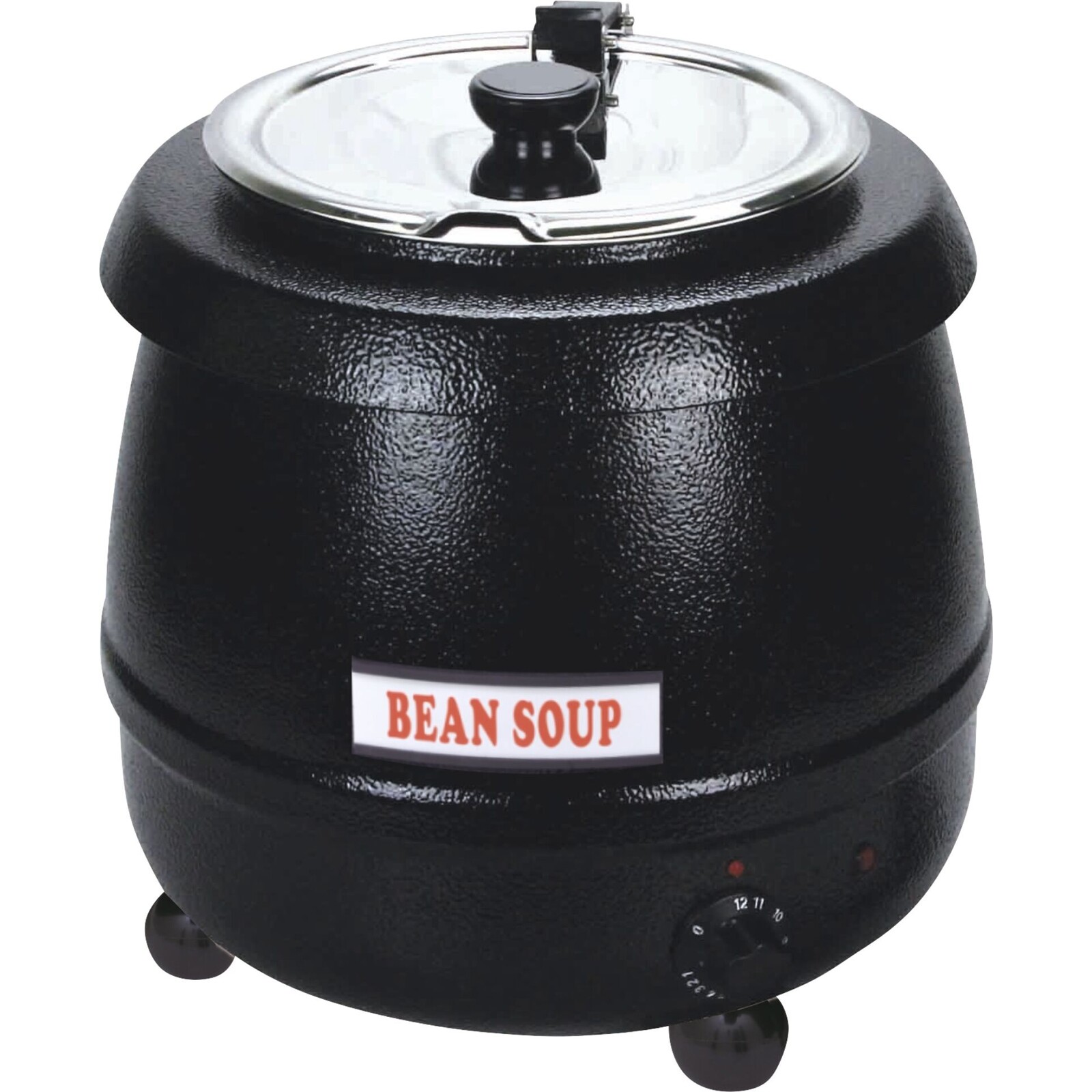 Stahlblech schwarz lackiert, Einsatztopf (herausnehmbar) mit dreh- und klappbarem Edelstahl-Scharnierdeckel 18/10, Löffelaussparung, hitzeisoliertem Griff, inkl. 14 magnetisch haftender Suppenbeschriftungen (D/E). Regelthermostat von 30°C bis 95°C.