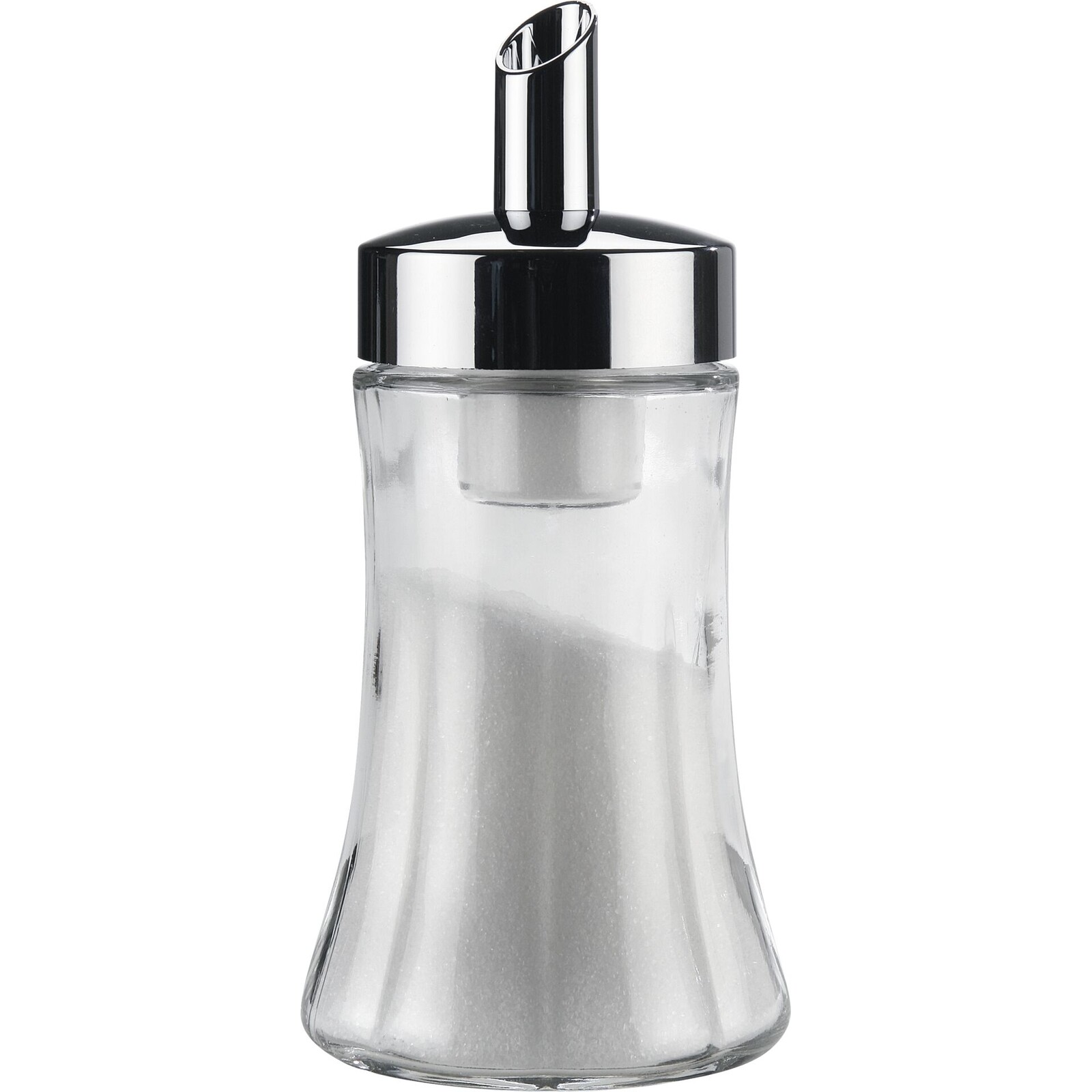Glas, verchromt. Mit diesem Streuer ist eine exakte Portionierung möglich. Der Zuckerspender hat direkt am Deckel eine Portionsvorgabe. Somit erhalten Sie je "Kippen" auch wirklich nur einen Teelöffel voll Zucker! Höhe ca. 17 cm.